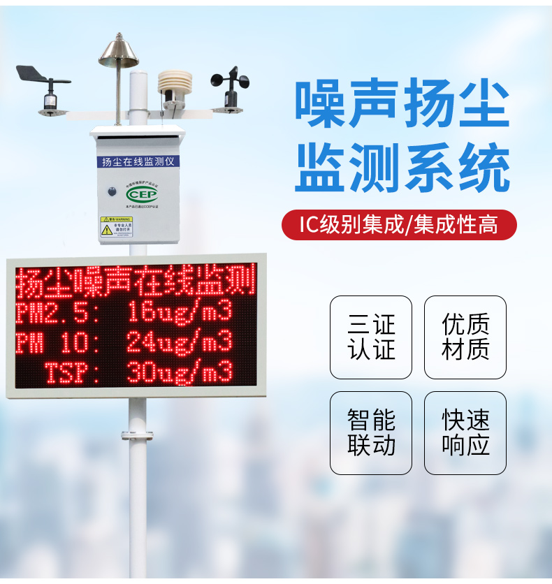 内置噪声扬尘;内置噪声扬尘自动监测传感器,量程30-130db/0-2mg/m3;
