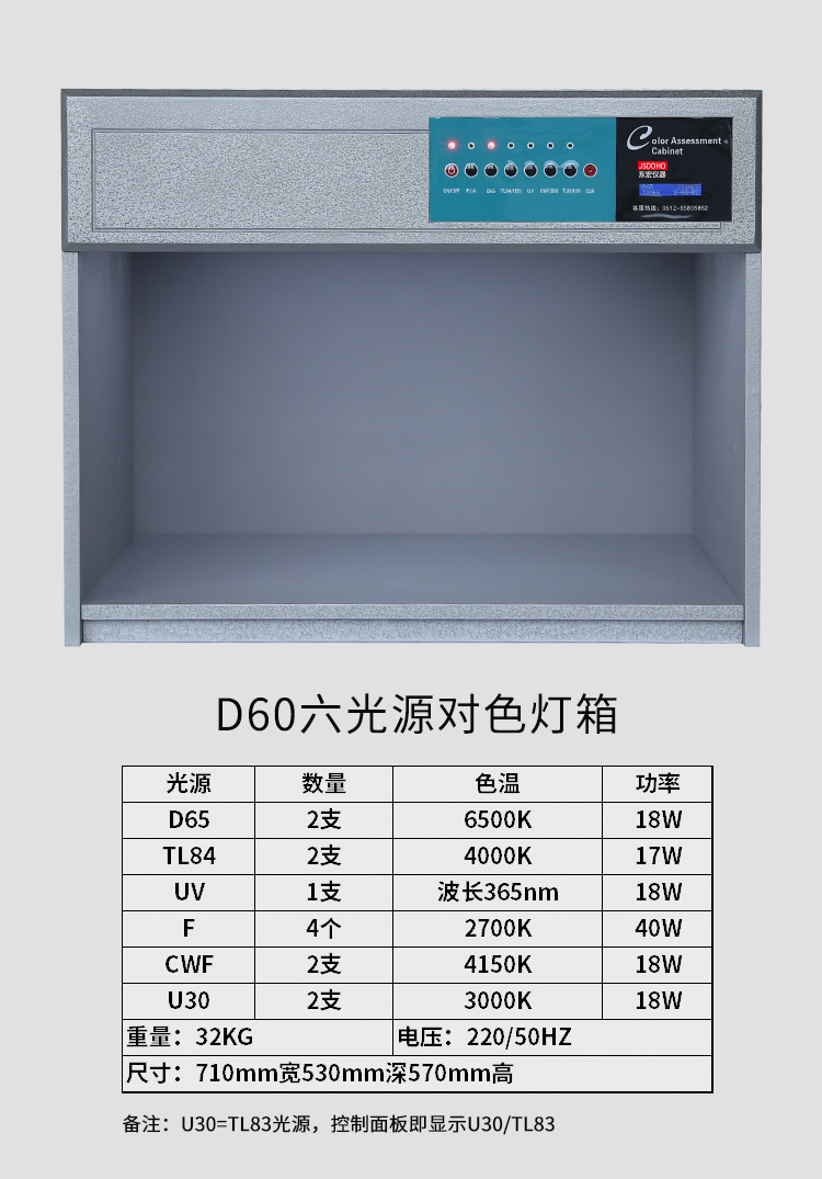 配置:D65,TL84,CWF,UV,U30,A六种光源